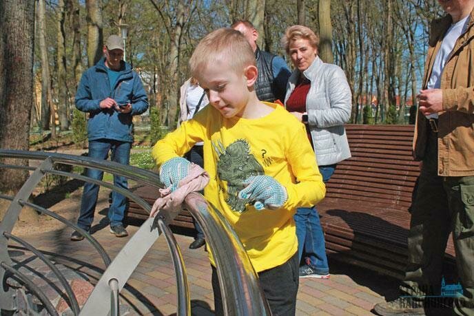 В их родном городе его проводили в парке Сенситивного развития. Погодка не подвела: в теплый солнечный день они отлично потрудились. Юра помогал сотрудникам парка с протиранием перил у фонтана: ему выдали перчатки и тряпочку с ведром воды. Он до блеска начистил ограждение!