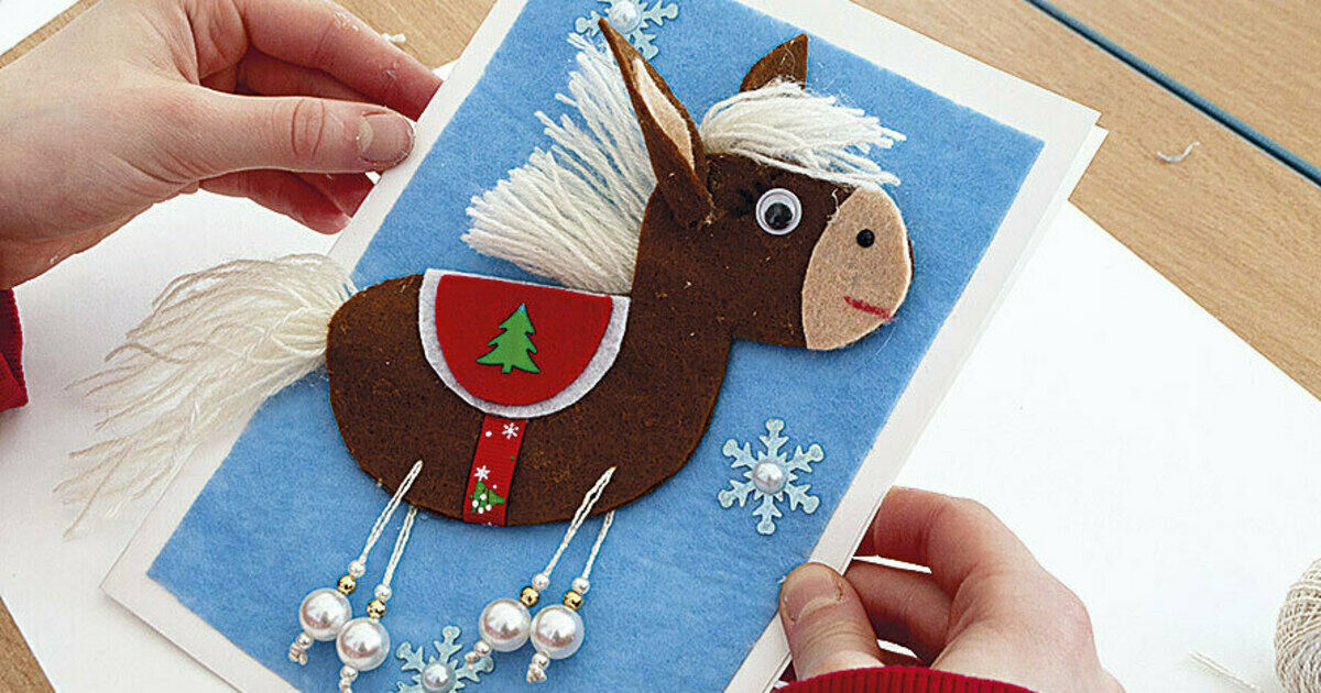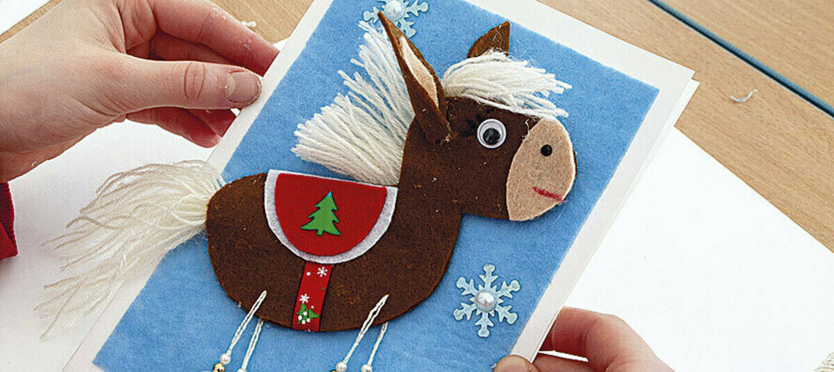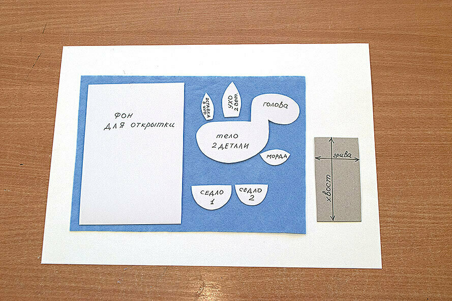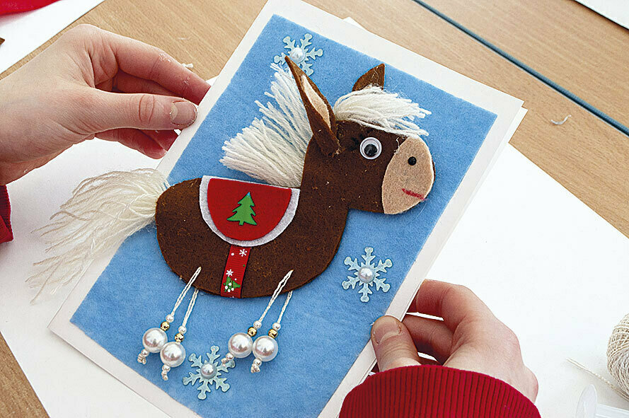 12. Приклеиваем лошадку на голубой фон. Украшаем открытку снежинками-пайетками.