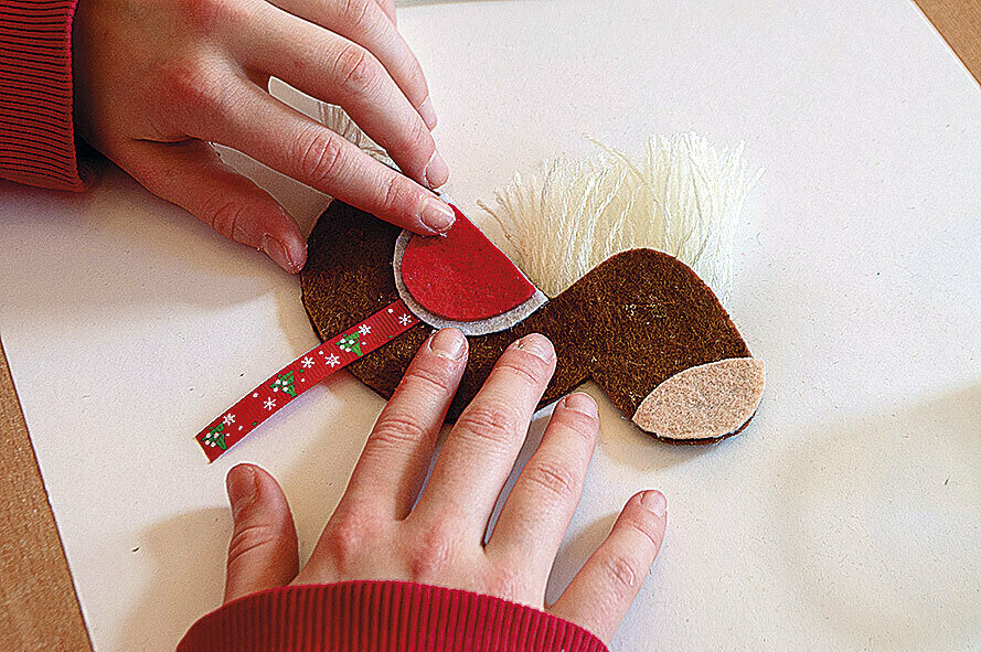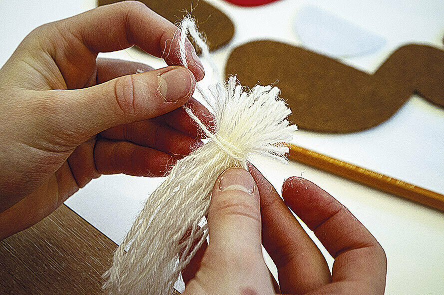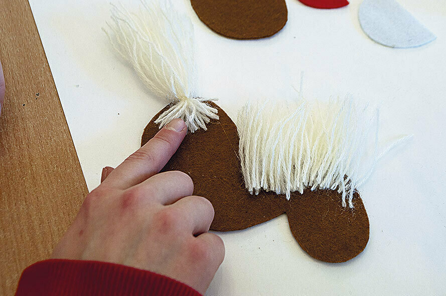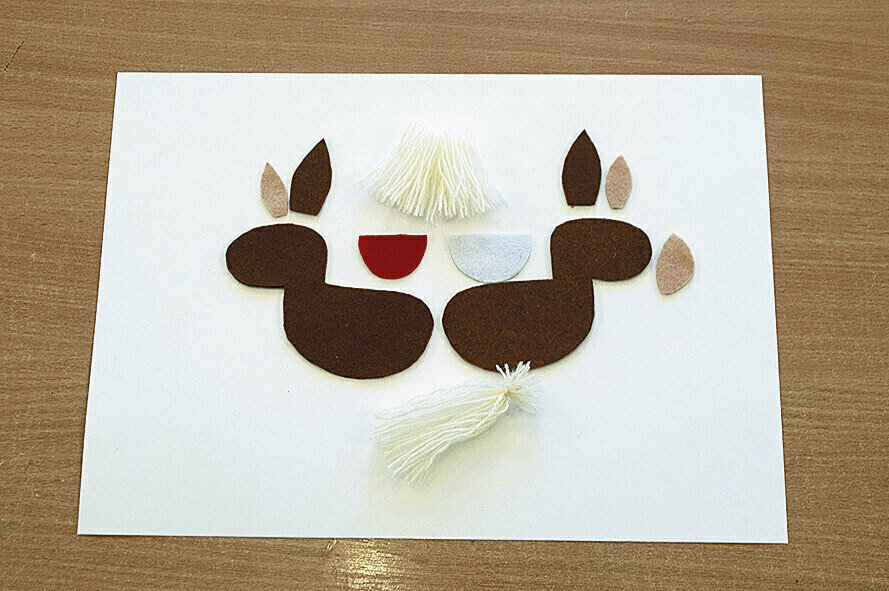4. Приклеиваем на одну из деталей лошадки кусочки пряжи, оформляя хвост и гриву.