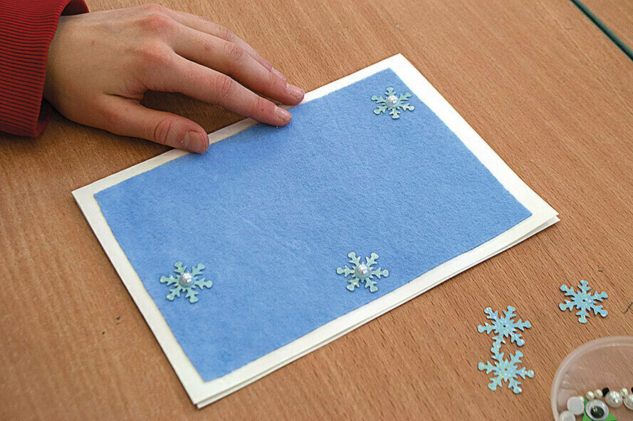 1. Для основы открытки складываем лист белой бумаги пополам, на лицевую сторону приклеиваем голубой фетр для фона.