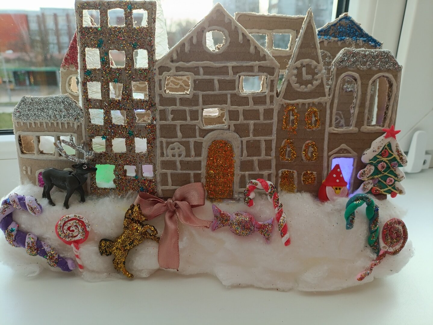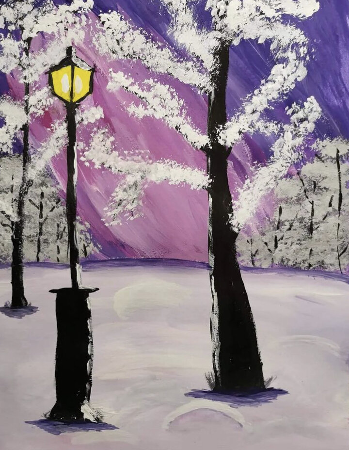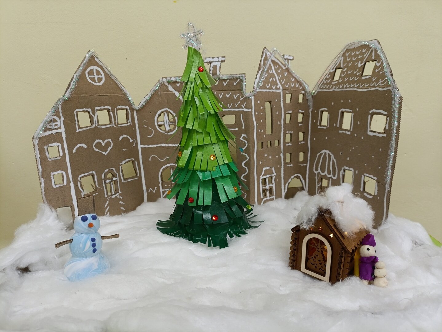 Маленькие фонарики как звёздочки рассыпаны по всему городу. Они светят так нежно и ласково, что даже снежинки, танцующие в воздухе, кажутся серебристыми звёздочками. На каждом углу стоят большие ёлки, увешанные разноцветными шарами и гирляндами.