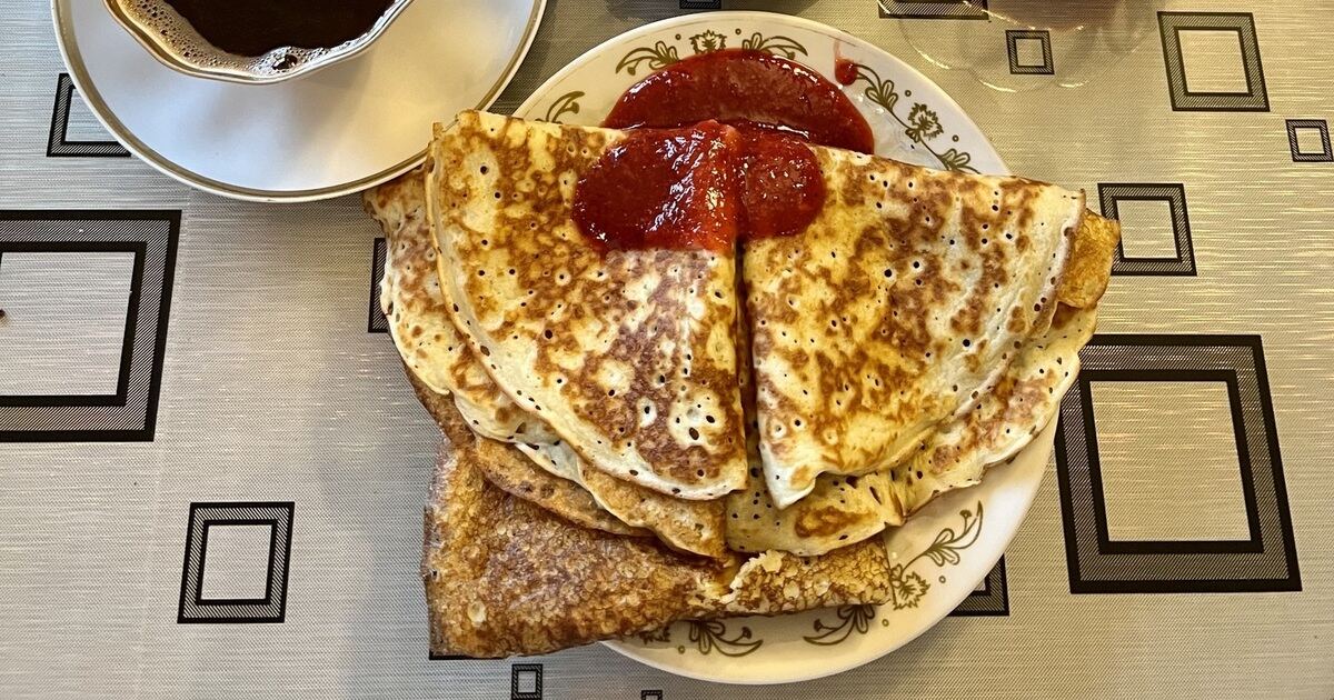 - Перемешать тесто повторно, вылить тесто на сковороду, пожарить тонкие блины, остудить. Подавать с мёдом или кленовым сиропом.