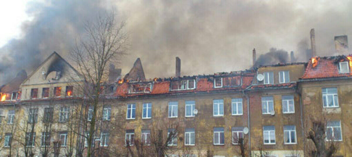 Пожар в 4-этажной бывшей военной казарме, а теперь это жилой дом, на улице Гагарина, 17а, в Черняховске вспыхнул около часа дня в воскресенье 11 января. По словам очевидцев, загорелась кровля, а уже через десять минут дом пылал.