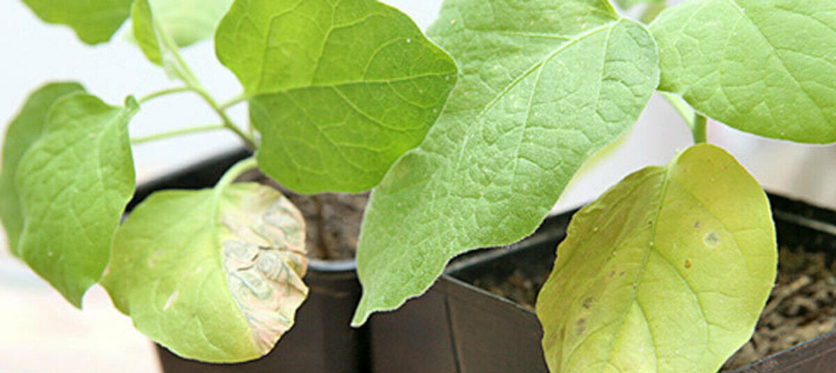 При недостатке питательных веществ рассада вытягивает их из нижних листьев – в итоге они желтеют. Даже при малейшем высветлении листьев срочно подкормите сеянцы любым комплексом удобрений для рассады. Если нижние листья облетели, подкормка частично выправит положение. От недостатка питания страдает рассада при выращивании на покупном торфогрунте. Он недостаточно питателен для прожорливых баклажанов, и подкармливать придется чаще. В следующий раз можете попробовать самостоятельно приготовить для рассады баклажанов более питательную почвенную смесь.
