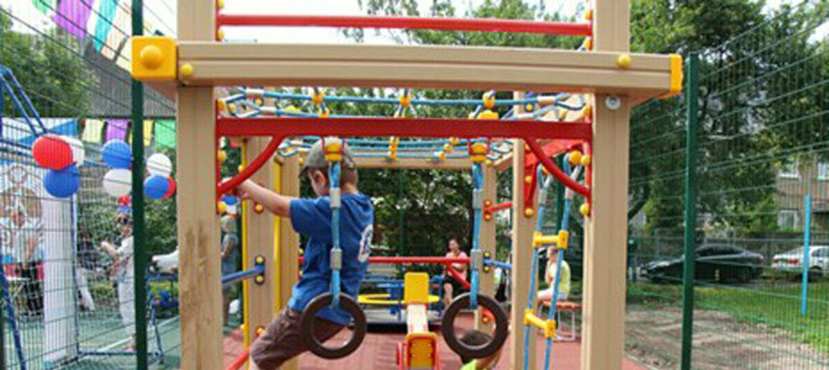 Универсальная площадка состоит из двух частей: детской и спортивной. На детской установлено современное игровое оборудование (игровой комплекс, качели, скамейки). На спортивной – синтетическое покрытие, ворота для мини-футбола, баскетбольные щиты. Обустройство площадки обошлось городскому бюджету в