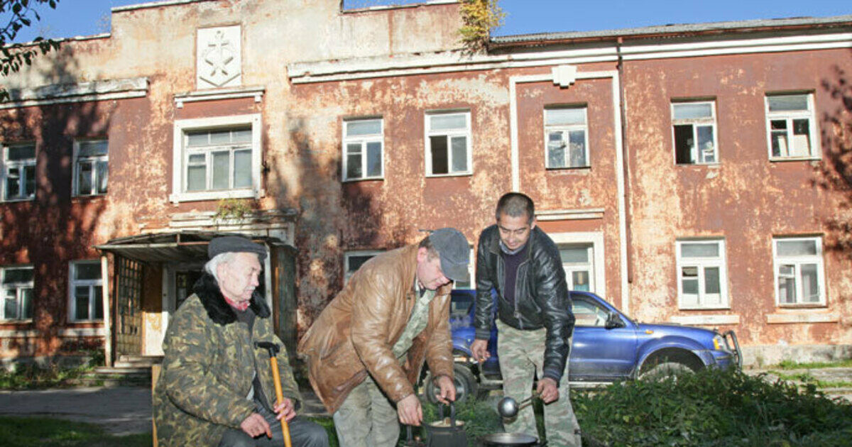 Во дворе мы застали 60-летнего Валерия Филькова, самого старшего из местных жителей. На самодельном очаге он с еще несколькими мужиками готовит обед – узбекскую шурпу и чай.