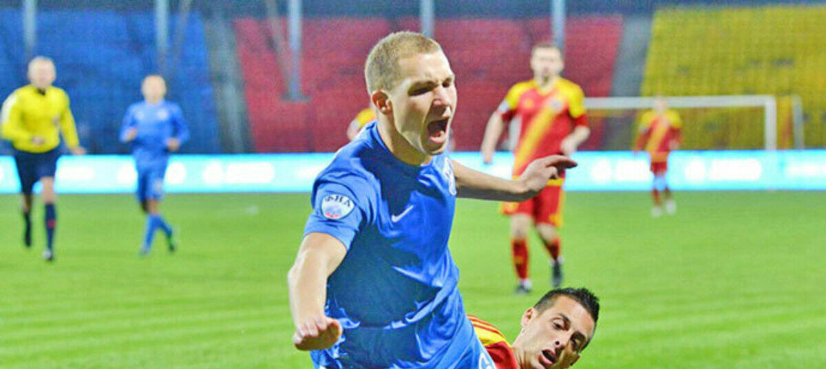 Встреча с канонирами получилась очень упорной – футболисты не жалели ног друг друга. В этом эпизоде досталось 22-летнему полузащитнику балтийцев Виталию Каленковичу
