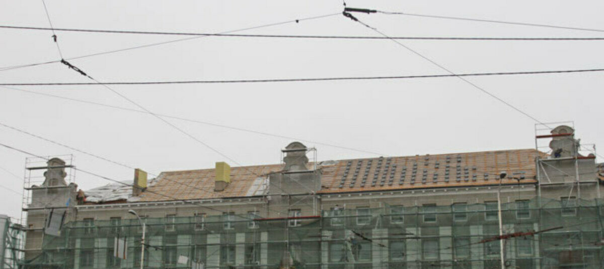 Ленинского проспекта и Черняховского вывесили плакат с криком о помощи, после чего ремонт кровли и фасадов возобновился.