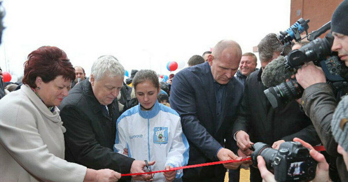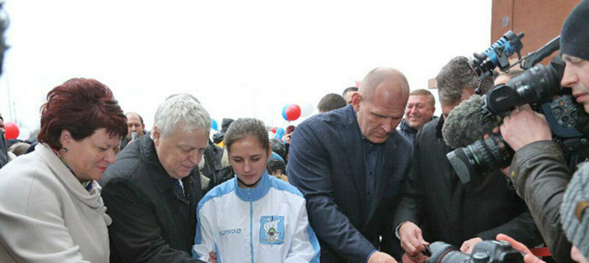 Красную ленточку нового спорткомплекса перерезают вице-премьер областного правительства Александр Богданов и знаменитый борец Александр Карелин