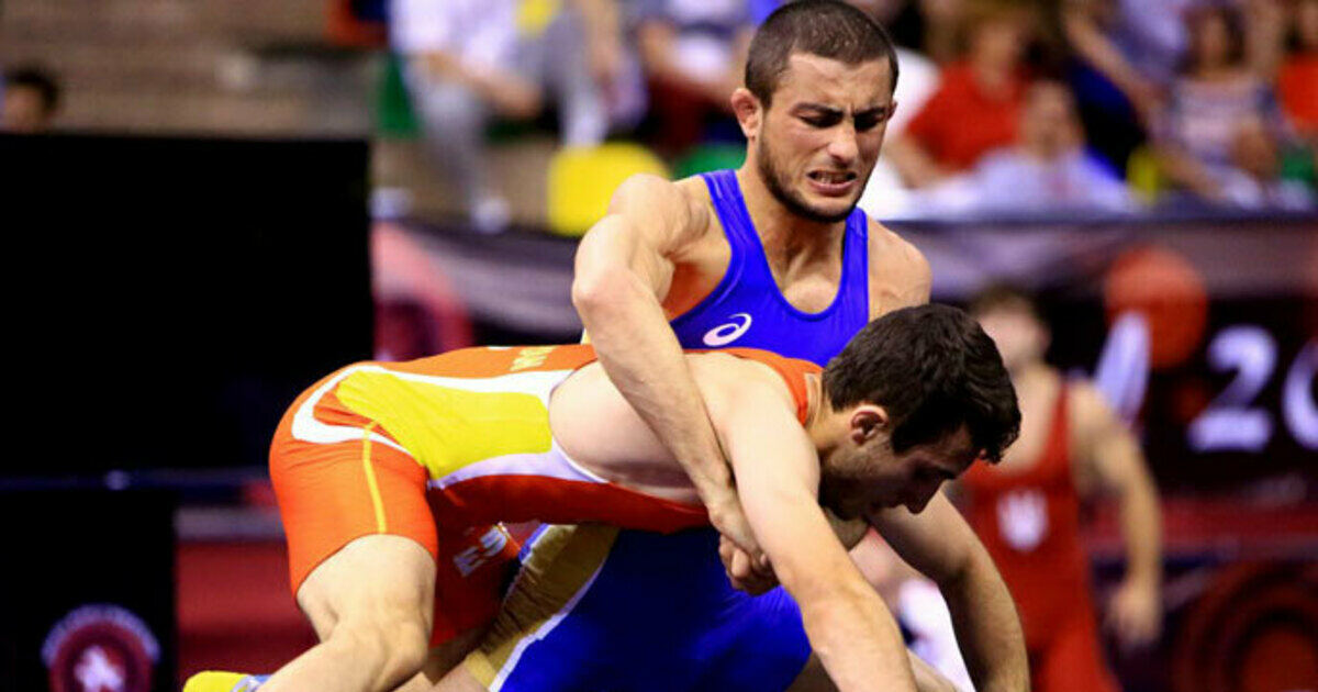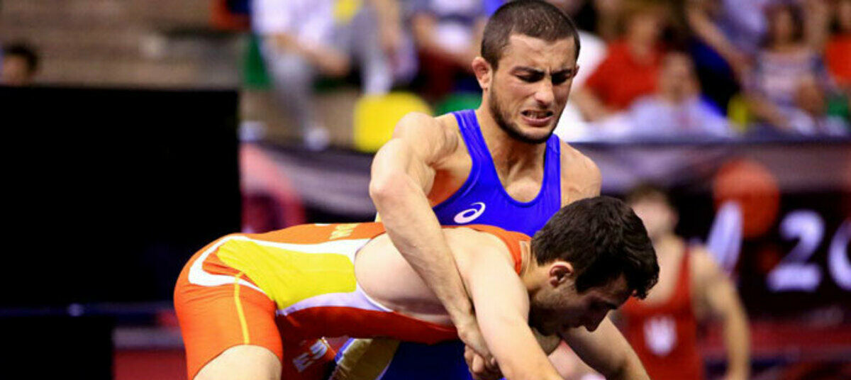 Ибрагим Ильясов (в синем трико) на борцовском ковре, постеленном во Дворце спорта «Юность», одолел всех соперников, в том числе победителя первенства мира