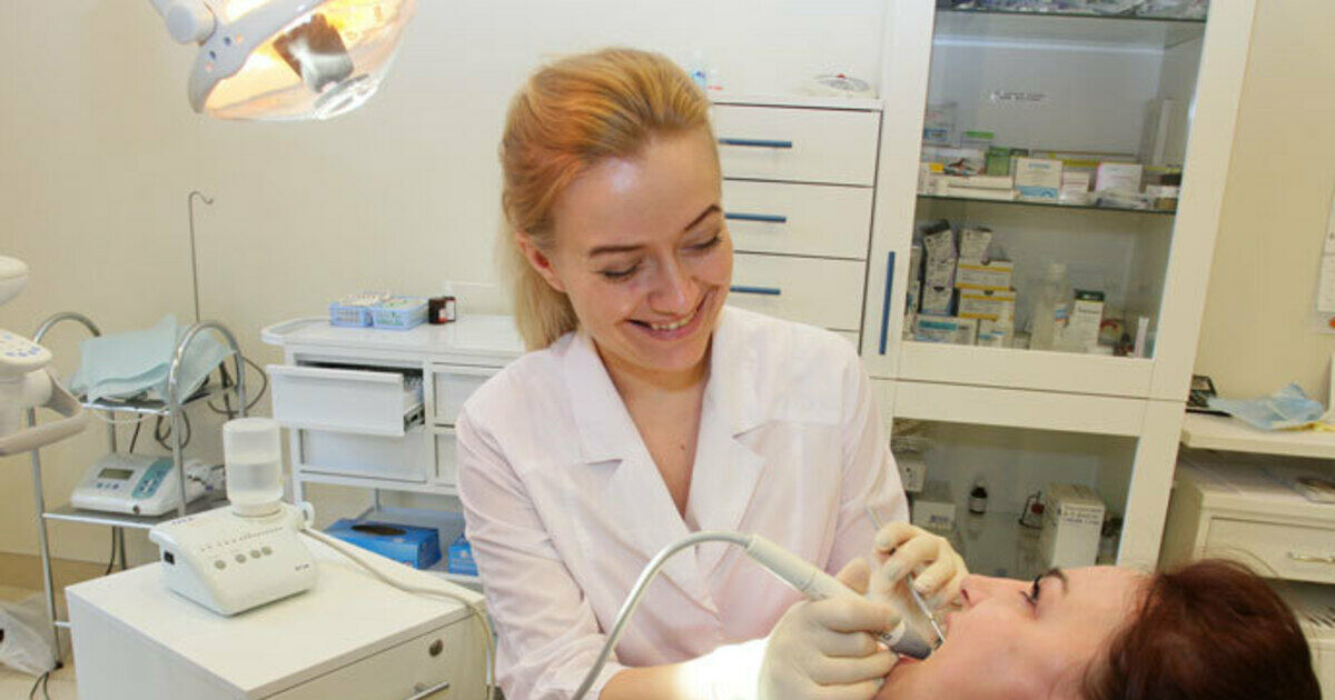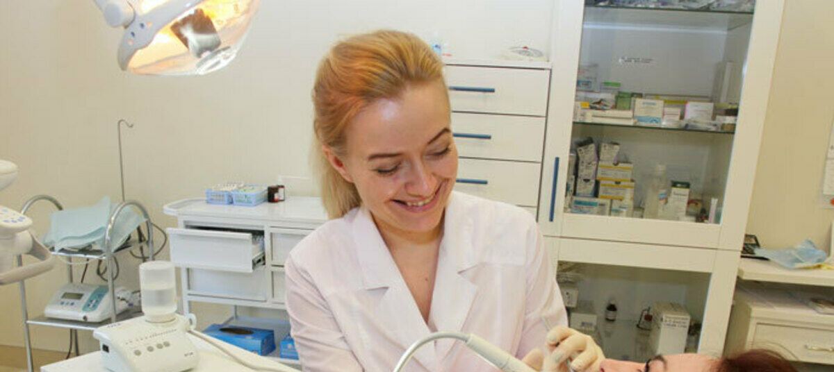 Хирург, пародонтолог Александра Логинова проводит пациентке ультразвуковую чистку зубов
