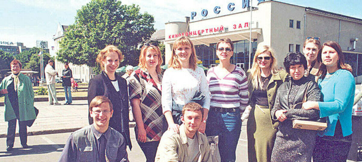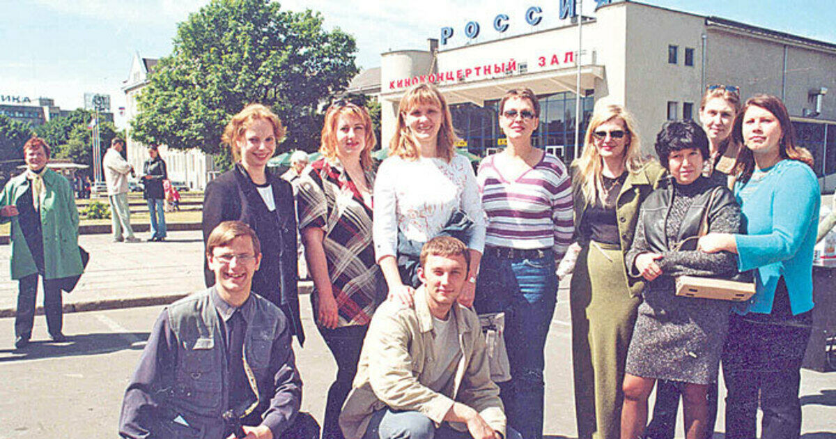 Начало 2000-х, редакция «СК»: Ольга Данилова (третья справа), Марина Васильева (четвертая слева), Николай Долгачёв (первый слева), тогда начинающий корреспондент, а сегодня – директор ГТРК «Калининград». На заднем плане – кинотеатр «Россия», которого уже нет