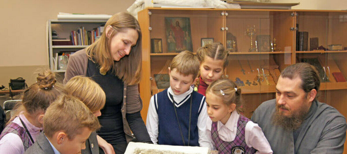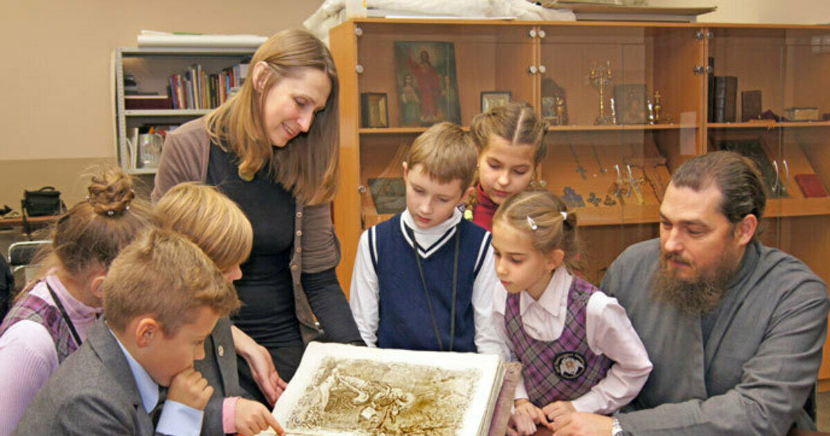 Руководитель школьного музея Ирина Аполонская и духовник гимназии показывают третьеклашкам редкий экспонат – рукописную книгу 1795 года: «В начале было слово...»