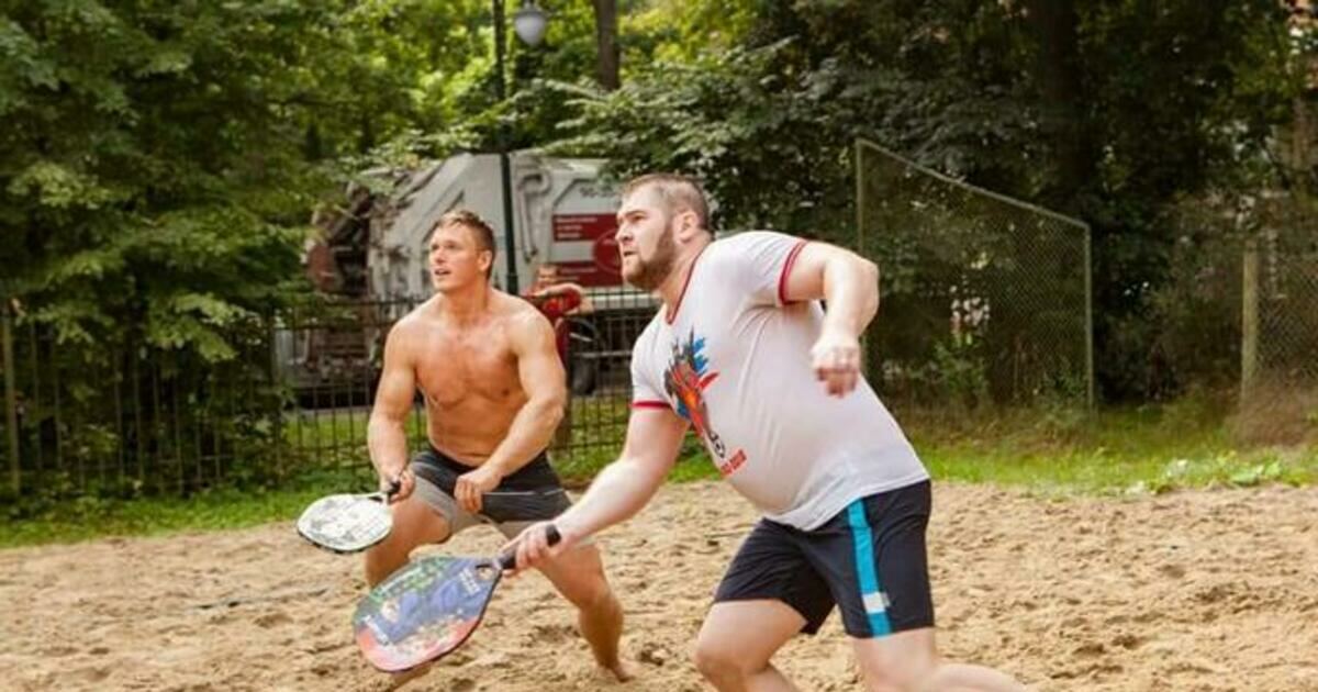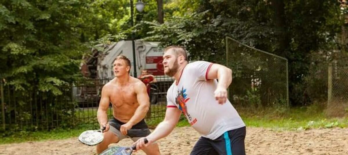 С теннисными ракетками на песке знаменитый штангист Дмитрий Лапиков (слева) и руководитель калининградского городского спорта Антон Панкратов