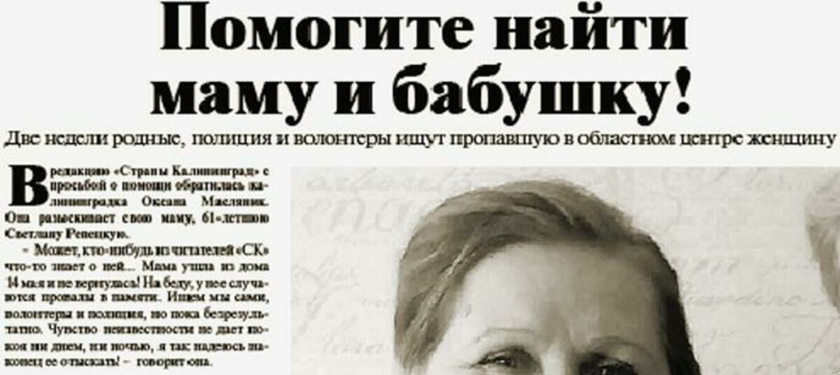 В статье «Помогите найти маму и бабушку!» («СК» № 22 от 30 мая этого года) мы рассказали о беде калининградки Оксаны Масляник. Она просила читателей помочь ей разыскать маму, 61-летнюю Светлану Репецкую.
