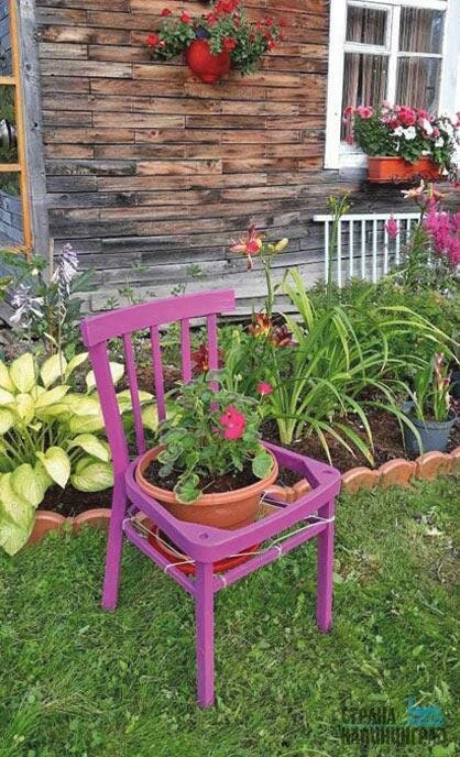 Такую оригинальную подставку для цветов предлагает семья Глуховых из Калининграда. Нужно взять старый стул (он уже был без сидушки) и покрасить его яркой краской. Шпагатом связать основу, чтобы кашпо не провалилось. Установить кашпо с цветком внутрь стула на основу из шпагата.
