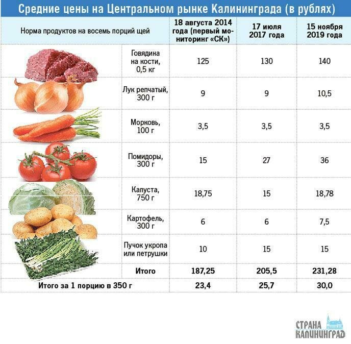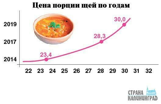 Как видно из нашей таблицы, в Калининграде щи были наиболее бюджетными летом 2014 года. К осени 2017-го стоимость тарелки увеличилась на 2 рубля 30 копеек, спустя еще два года, в ноябре 2019-го, – на 6 рублей 6 копеек. И продержалась примерно на этом уровне еще год. В общем, несмотря на то, что овощи сегодня местные, цена народного супа неуклонно растет…