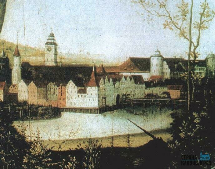 Фрагмент эпитафии Ганса Нимпша, написанный кёнигсбергским художником XVI века Генрихом Кёнигсвизером. Это самое старшее по времени живописное изображение нашего города. Примерно таким его и увидел Коперник