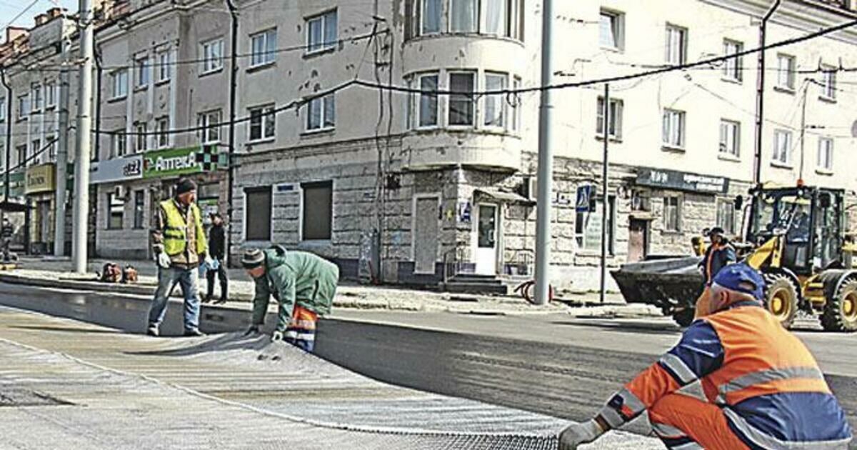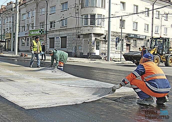 Асфальтовое покрытие строители укладывают на слой пластиковой сетки
