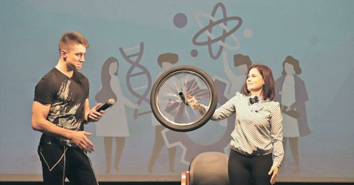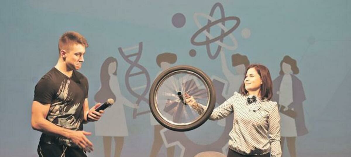Наталья Азаренко, радиофизик по профессии, выходит на сцену и проводит опыты на глазах у любознательных детей