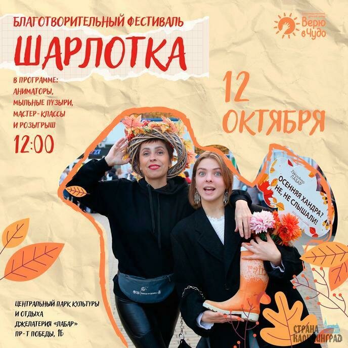 В этот же день - благотворительный фестиваль шарлотки (0+) в Центральном парке Калининграда. Каждый участник может приготовить любую выпечку, подарить её детскому центру «Верю в чудо» и продать на фестивале. Все вырученные средства пойдут на организацию реабилитационного лагеря «Мираклион». В программе - шоу мыльных пузырей мастер-классы, ярмарка книг и другие яркие впечатления.