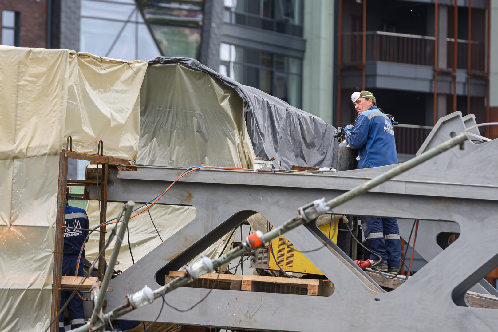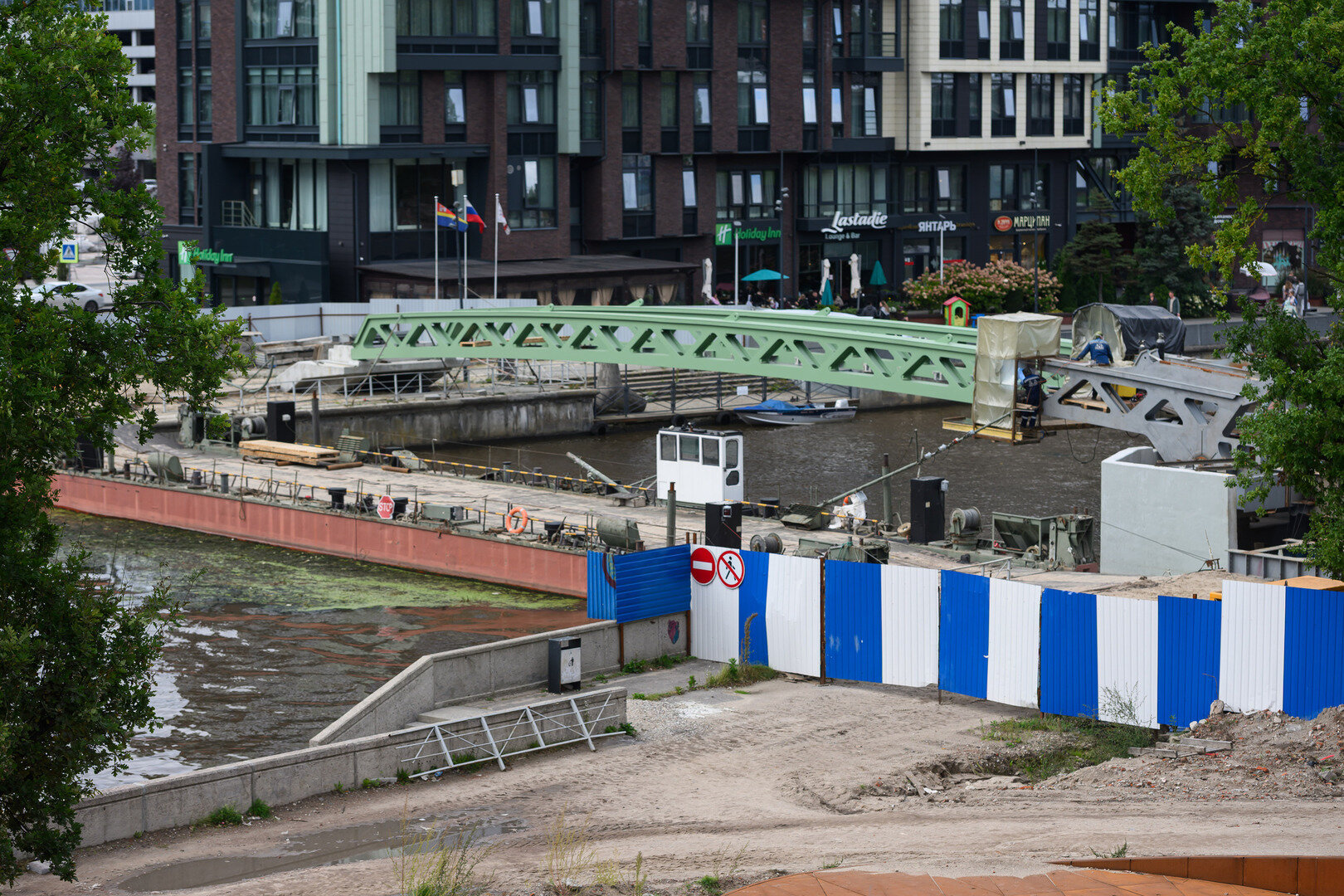 В Калининграде на стройке Философского моста недалеко от набережной Музея Мирового океана начали устанавливать арочный пролет. По перенесенным уже в который раз срокам, доделать все собираются к октябрю этого года.