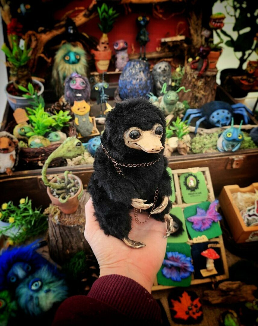 Материалы подбираю интуитивно. Иногда образ появляется сразу, иногда к нему иду месяцами. В процессе ощущаю, какой мех, цвет или фактура подойдут именно этому существу. Мне важно, чтобы материал «зазвучал» вместе с образом — тогда всё складывается естественно.