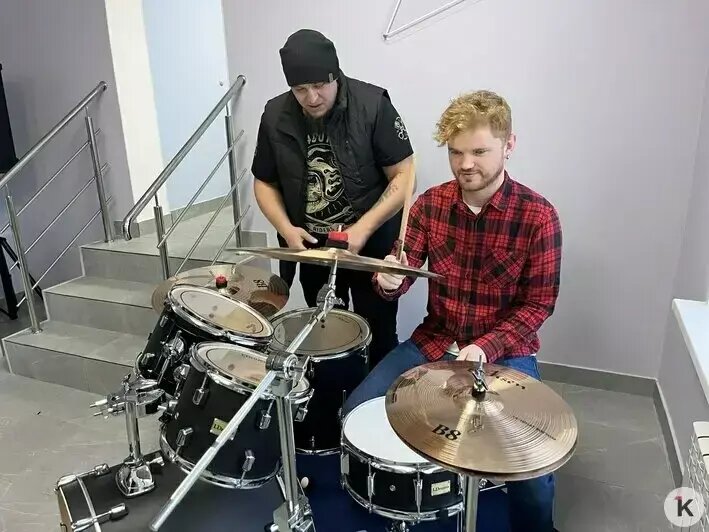 На улице Мукомольной, 12б, будут заниматься молодёжные творческие коллективы. В холле стоят ударная установка и другое музыкальное оборудование.
