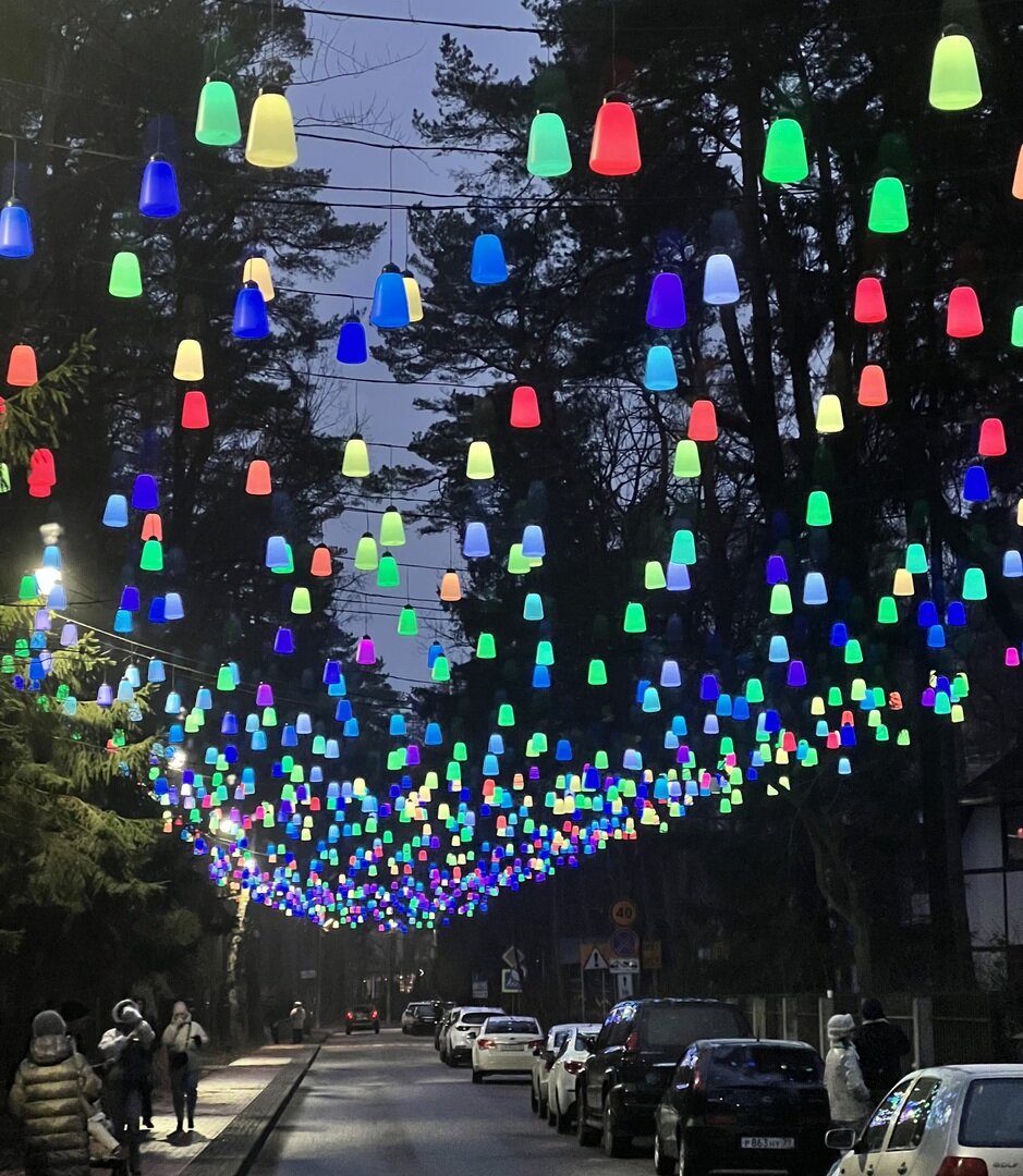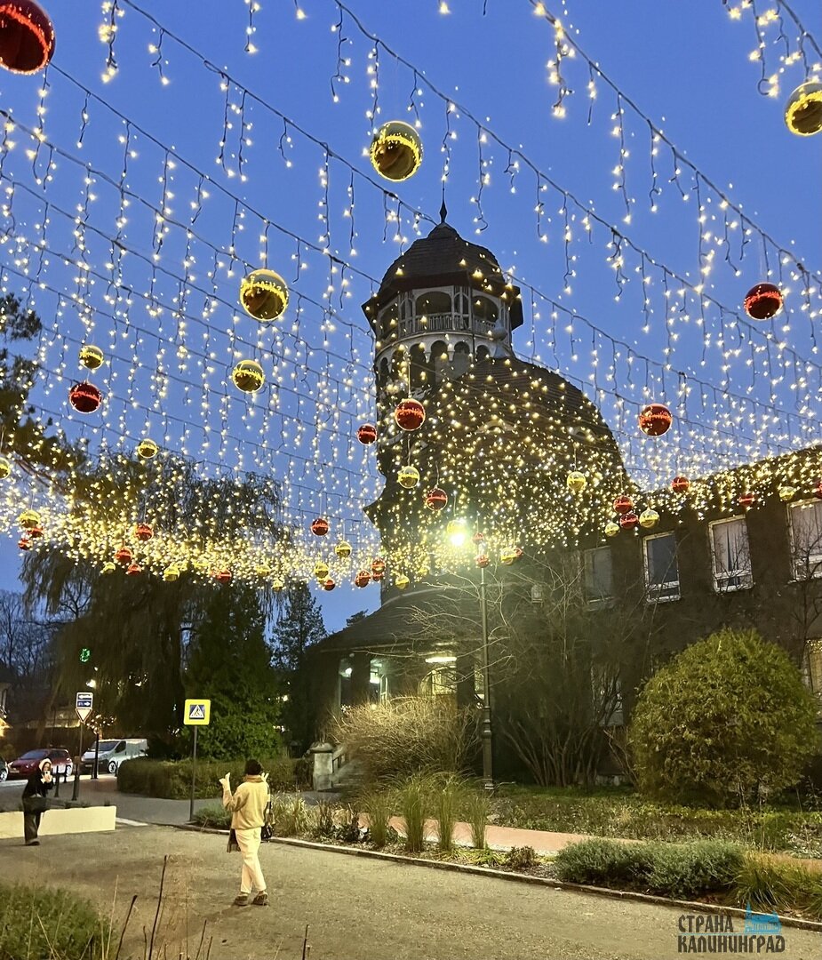 В Светлогорске уже украсили улицы, и таких на этот раз намного больше. Новой локацией для прогулок и фото стала улица Курортная около башни грязелечебницы. Гирлянды покрывают почти всю территорию — получилось волшебно.