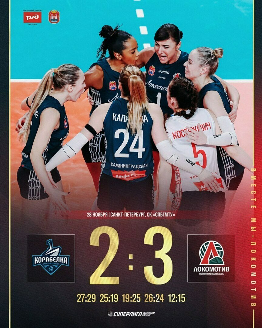 Итоговый счет матча «Корабелка» - «Локомотив» - 2:3 (27:29, 25:19, 19:25, 26:24, 12:15).