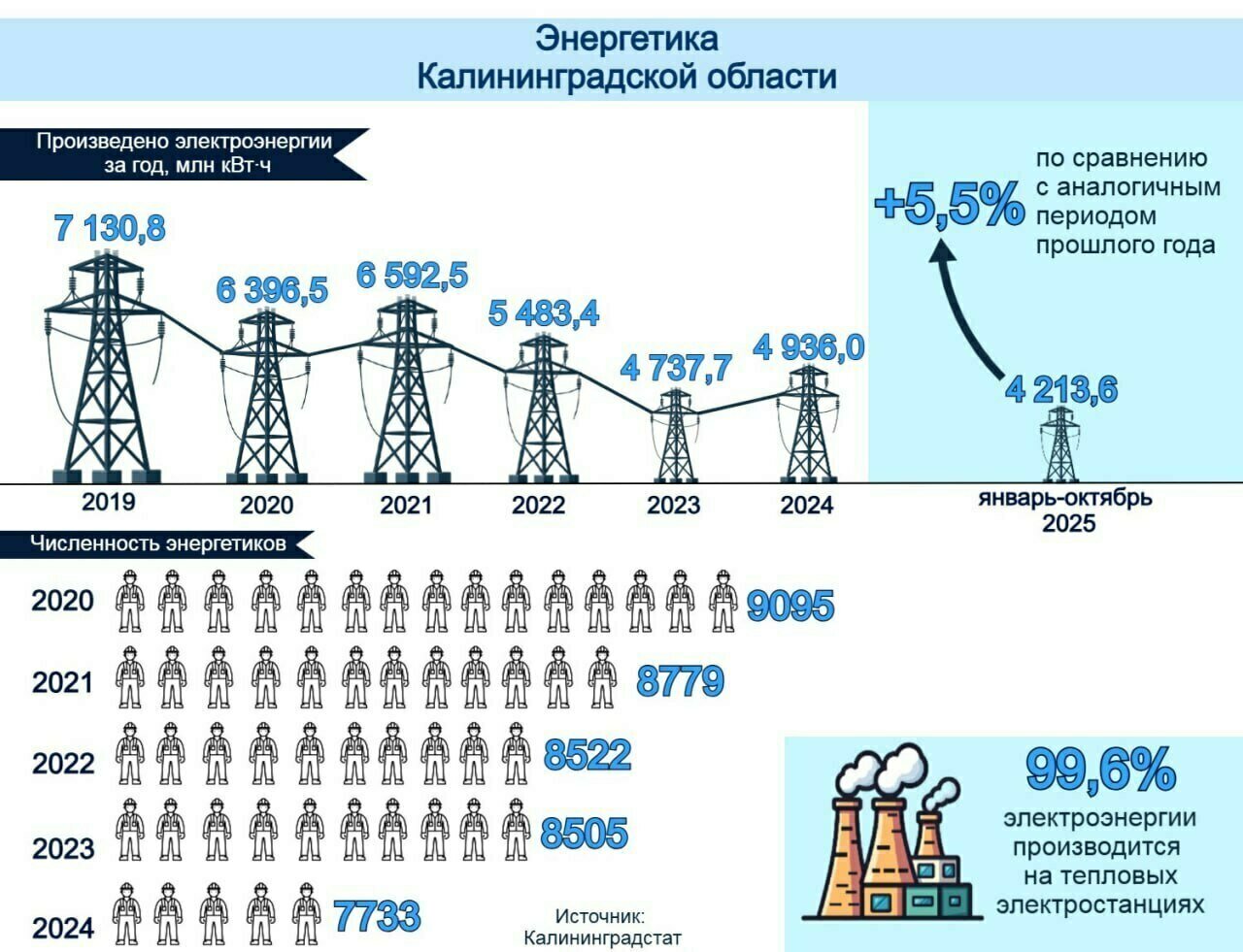 В Калининградской области за десять месяцев 2025 года выработка электроэнергии выросла на 5,5% по сравнению с тем же периодом прошлого года. Об этом сообщает Калининградстат.