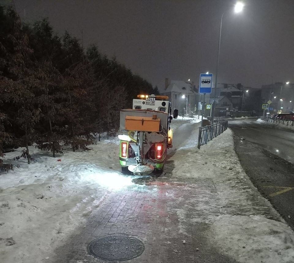 На посыпку тротуаров экстренно дополнительно перебросили персонал и технику, которые обычно занимаются вывозом снега.