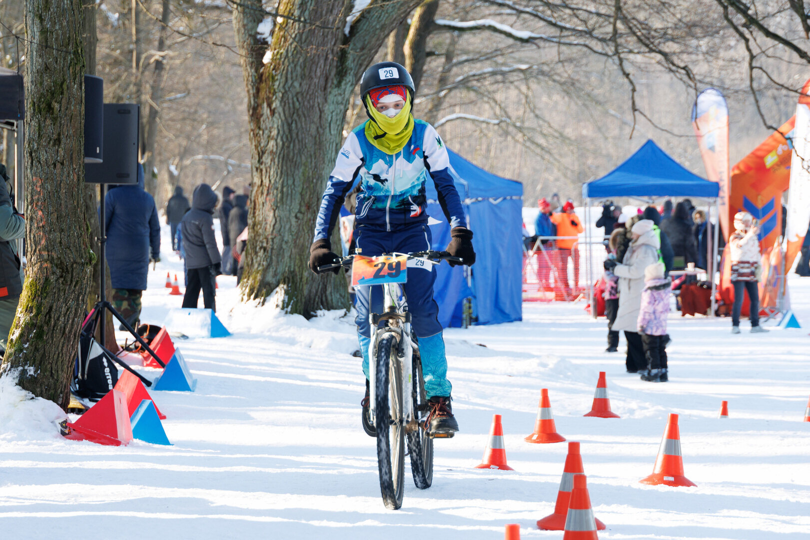 Спортсмены и любители серьезно участвовали в зимнем триатлоне: пробежали 2 километра, проехали еще 3 километра на велосипедах и 2 километра прошли на лыжах.