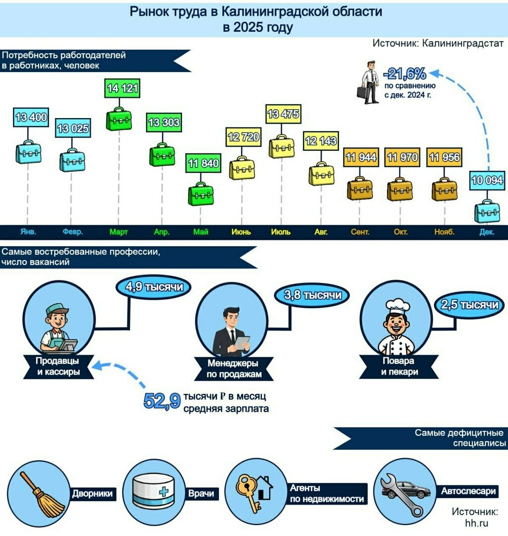 В 2025 году рынок труда Калининградской области постепенно остыл: число вакансий снизилось с 13,4 тысячи в начале года до 10,1 тысячи в декабре. Пик спроса пришёлся на март (14,1 тысячи), после чего в мае произошло заметное падение, а осенью показатель стабилизировался около 12 тысяч вакансий в месяц.