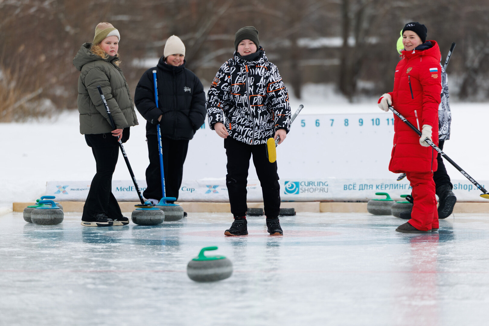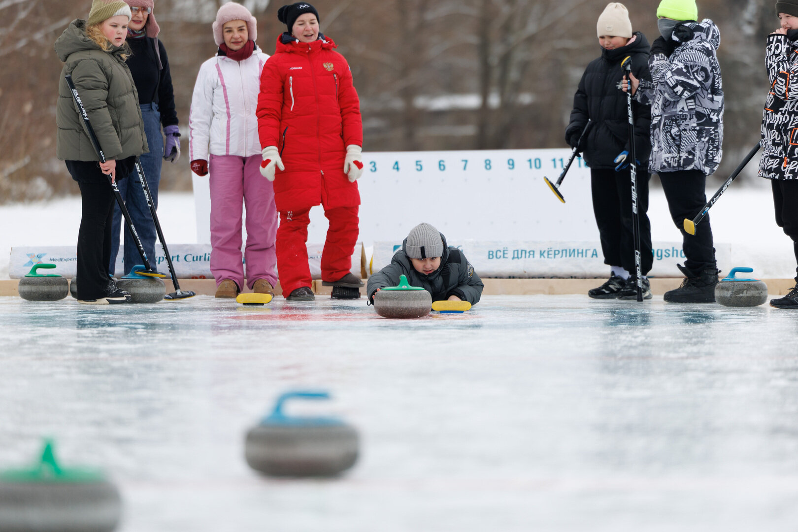 Больше 30 метров в длину, свыше пяти в ширину. Не полноформатный, но вполне себе мини-кёрлинг на два «дома», два комплекта настоящих игровых камней из шотландского гранита и прочего сопутствующего оборудования общей массой более чем на полтонны.
