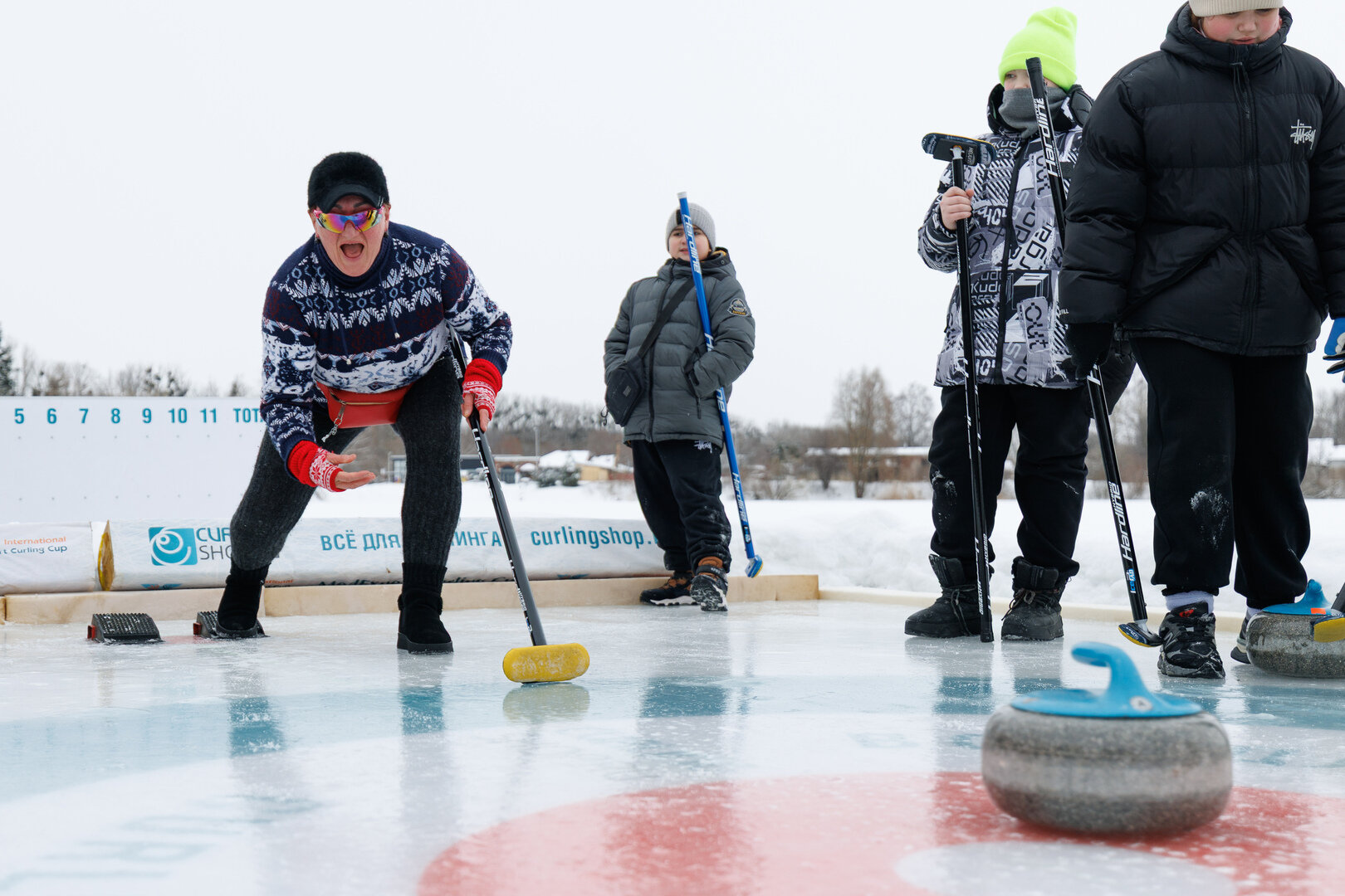 С ними в одной команде против молодёжи с удовольствием сыграли и даже набрали первые в своей жизни баллы по кёрлингу примы зимнего плавания из «Янтарных Моржей» Наталья Алещенко и Эрика Радохлеб.