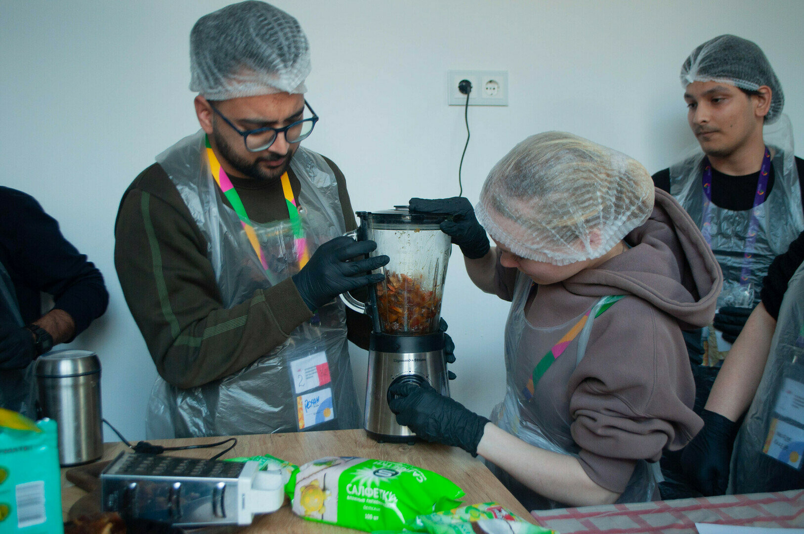 Студент из Индии Зохеб старательно шинкует укроп. Его коллега по команде, Мария де лос Анджелес Луна из Эквадора, измельчает солёные огурцы на тёрке: