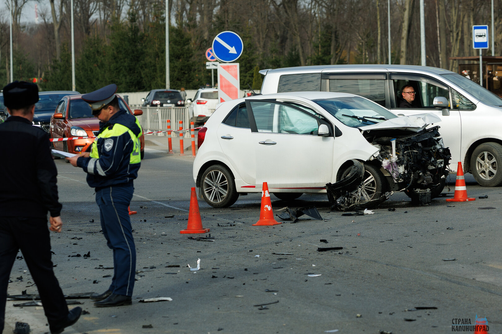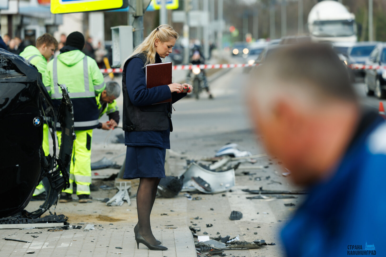 – Водитель автомобиля «БМВ», двигаясь со стороны Полесска в сторону Калининграда в крайней левой полосе, столкнулся с автомобилем «Киа», осуществлявшим поворот налево. После чего, потеряв управление, он выехал на тротуар, где опрокинулся и допустил наезд на троих пешеходов, – сообщается в Тг-канале областной Госавтоинспекции.
