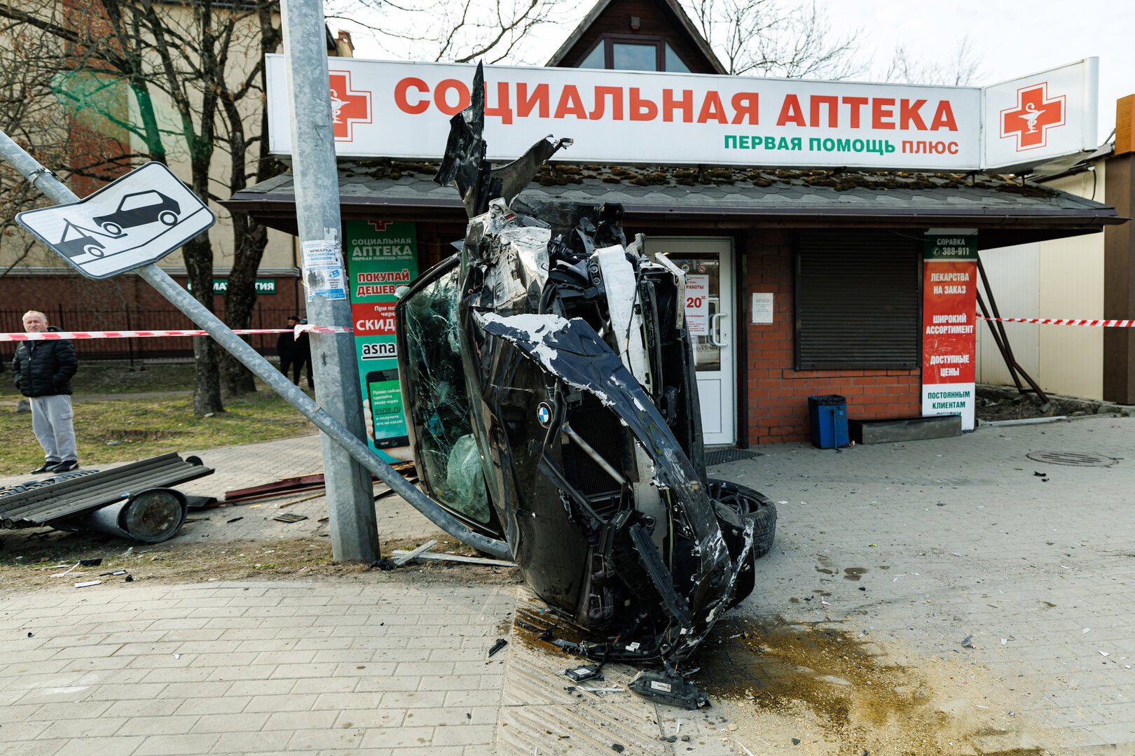 Как сообщает портал «Клопс» со слов очевидцев, молодой водитель «БМВ» ехал на довольно большой скорости и врезался в поворачивавшую со встречной «Киа». Из-за удара «БМВ» потеряла управление и вылетела прямо на пешеходов, которые собирались переходить дорогу. После чего машина протаранила здание аптеки и врезалась в фонарь.