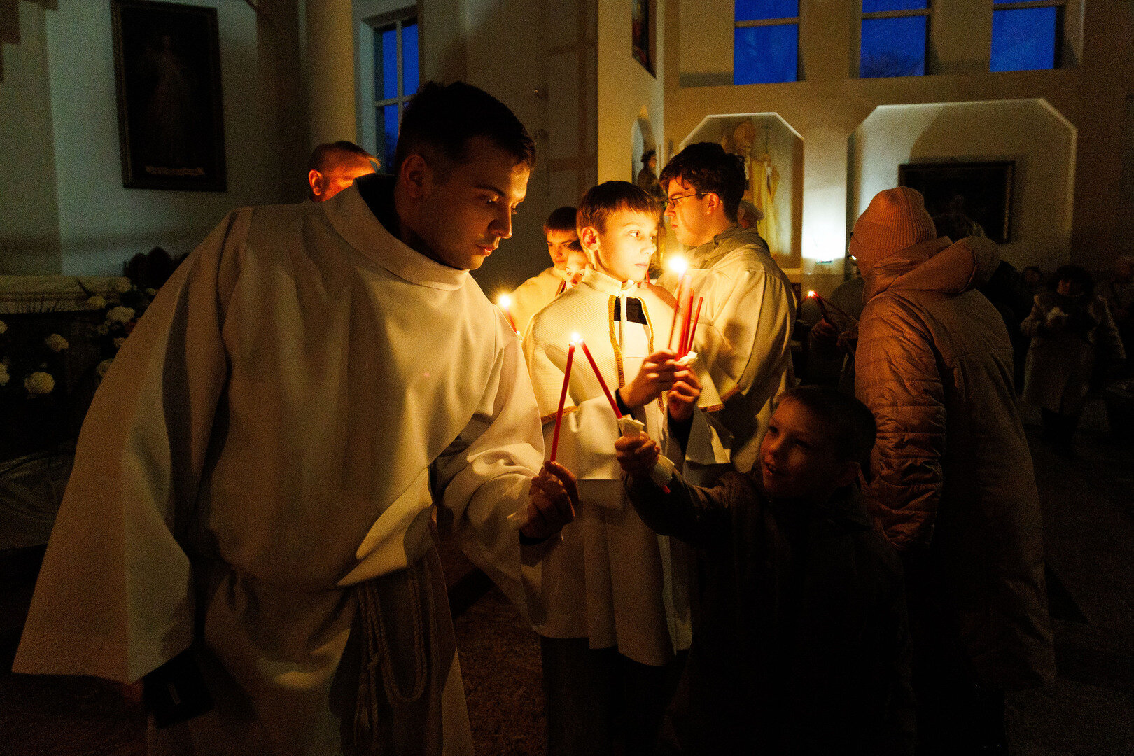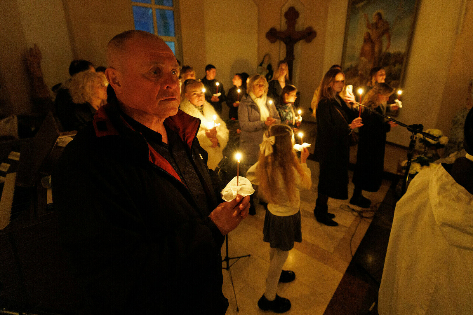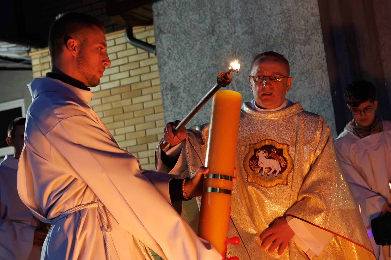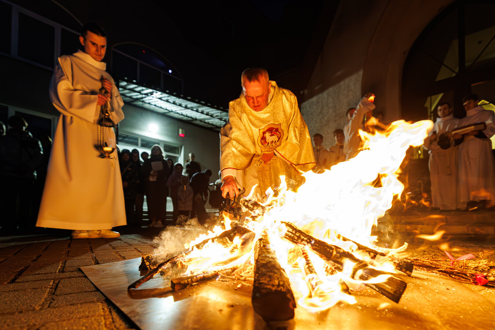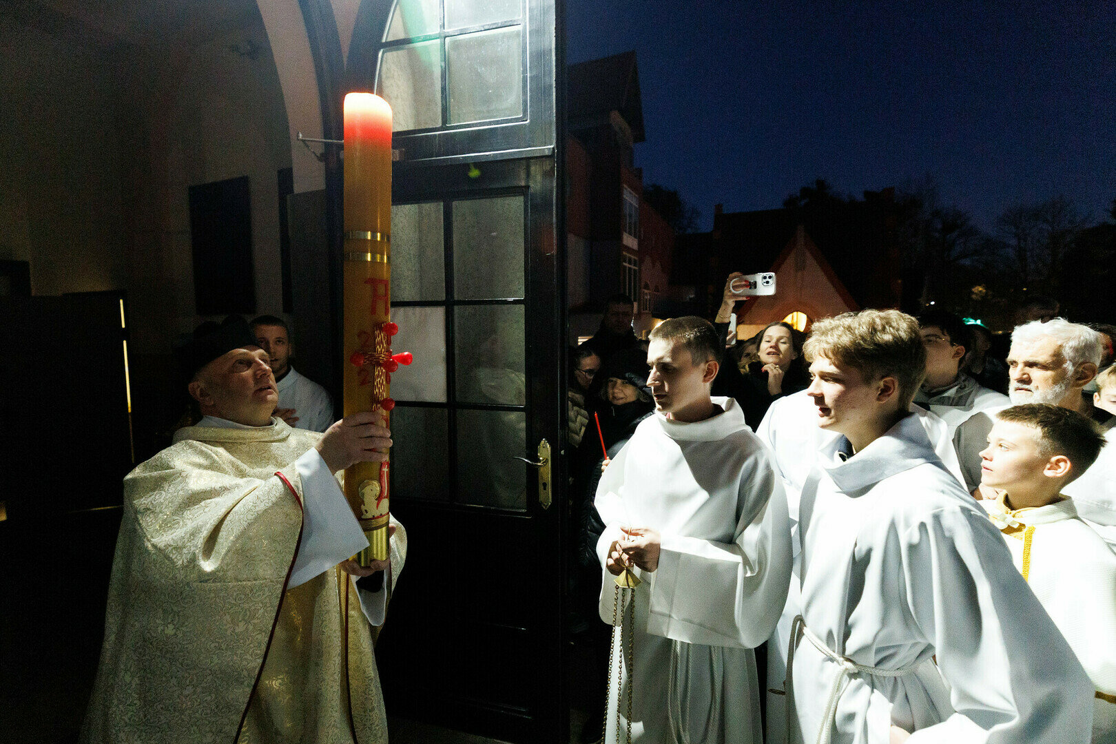 В храме святого Адальберта (ул. Александра Невского, 78в) 4 апреля в 20:00 состоялось Навечерие Пасхи. На богослужении побывал фотокорреспондент «Страны Калининград». Навечерие Пасхи — это центральное богослужение в католической традиции, которое совершается в ночь с Великой субботы на Пасхальное воскресенье. Оно символизирует переход от смерти к жизни, от тьмы к свету и считается вершиной всего литургического года. Во дворе храма разжигается костёр, от которого священник зажигает большую пасхальную свечу — пасхал (символ Христа, победившего тьму). Затем священник с зажжённой свечой входит в затемнённый храм и произносит древний гимн Exsultet («Да ликуют»), возвещая о воскрешении Христа.