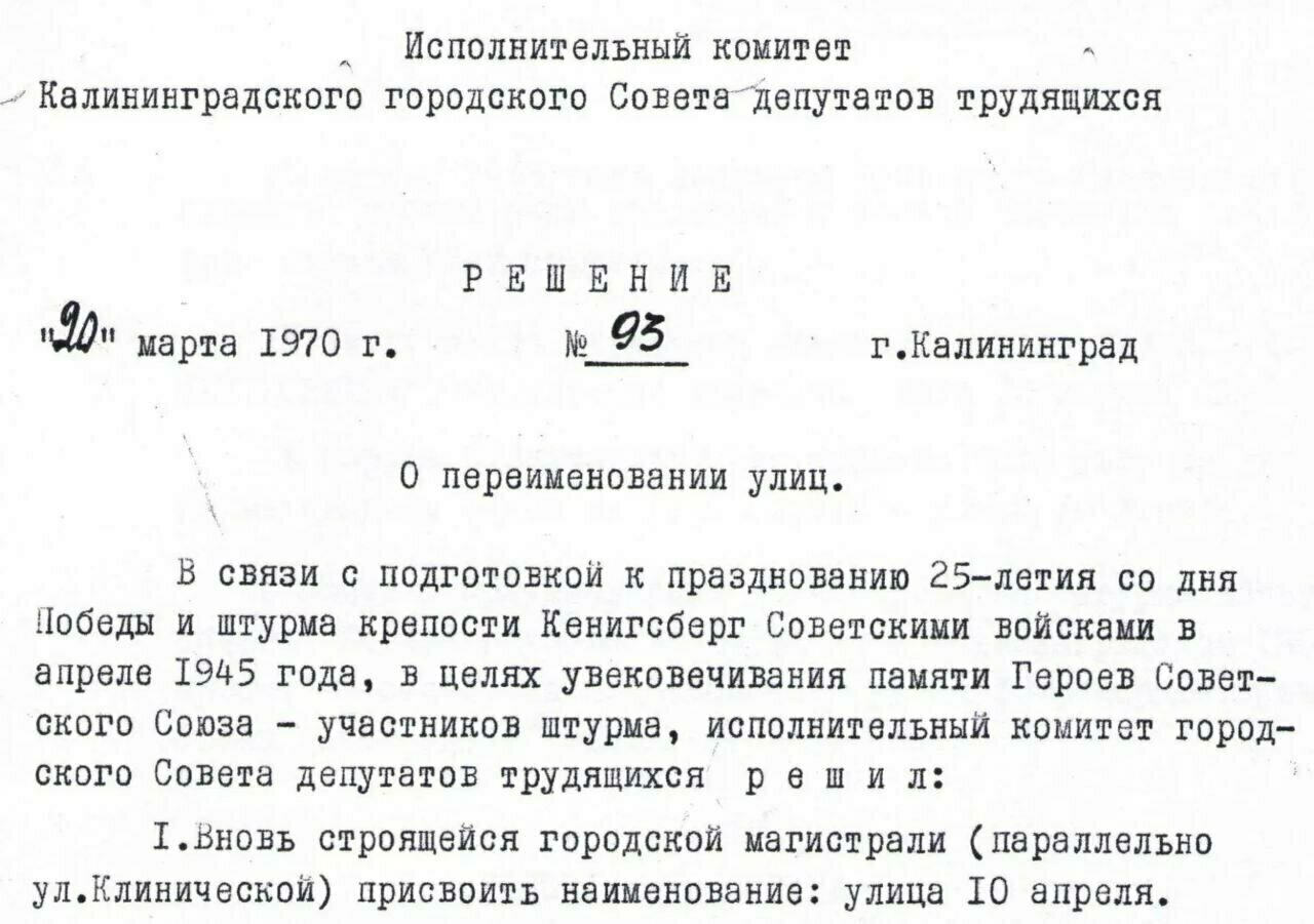 В год 20-летия Победы вот какую позицию озвучил в «Калининградской правде» полковник С. Господарев, член совета Военно-научного общества: «В честь исторической даты была у нас в городе улица 10 Апреля. Она неоправданно переименована. Ветераны Великой Отечественной войны высказывают единодушное мнение: восстановить название улицы 10 Апреля как символ завершения штурма Кёнигсберга».